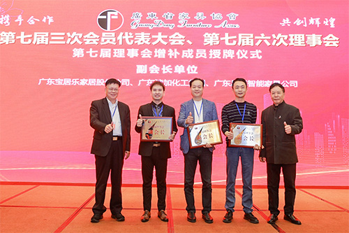 为加强协会组织建设,根据《广东省家具协会章程》规定,会议审议通过了《第七届理事会调整议案》,同时举行了增补成员授牌仪式。增补广东宝居乐家居股份有限公司、广东漆加化工集团有限公司、广东易卓智能家具有限公司为副会长单位,佛山市信南标紧固件有限公司、广东凯凌生态环境科技有限公司、广东意达数控科技有限公司为理事单位。由于企业经营发展转型,免去广东一品实业集团有限公司执行会长单位职务,佛山市佳林物业管理有限公司副会长单位职务。