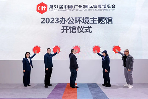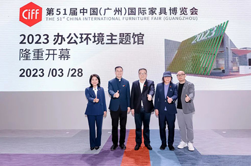 中国对外贸易广州展览有限公司副总经理陈旺辉、广东省家具协会会长王克、广州及上海办公环境主题馆总规划/办公联创始人许照明、优思佩总经理宁勇、办公联传媒集团总经理梁晓燕共同开启本次主题馆。