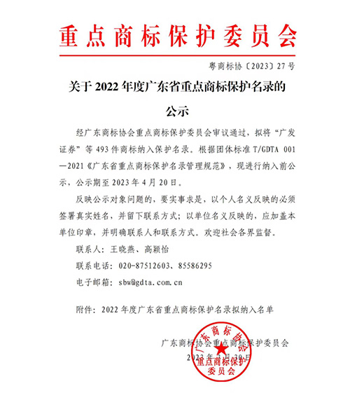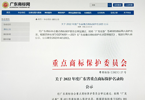 会议汇报了2022年度省重点商标保护名录的申报、形式审查、专家评审、秘书处复核等工作情况。 最后,经省重点商标保护名录商保委全体委员审议通过,拟将“广发证券”等493件商标纳入保护名录,具体名单在广东商标网进行公示,公示期至4月20日,敬请留意。