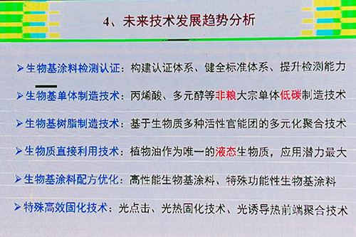 主题报告环节,广东省涂料行业协会专家委员会委员/华南农业大学材料与能源学院教授袁腾作《生物基涂料介绍及未来技术发展趋势分析》,从生物基研究背景、生物基涂料简介、生物基涂料的认证、生物基涂料常用树脂、未来技术发展趋势分析等五大板块来解读生物基涂料。袁教授指出,到2025年,非粮生物基材料产业基本形成自主创新能力强、产品体系不断丰富、绿色循环低碳的创新发展生态。非粮生物质原料利用和应用技术基本成熟,部分非粮生物基产品竞争力与化石基产品相当,高质量、可持续的供给和消费体系初步建立。未来可以从生物基涂料的检测认证、单体制造技术、树脂制造技术、直接利用技术、配方优化、特殊高效固化技术等几个维度推进生物基涂料的发展。