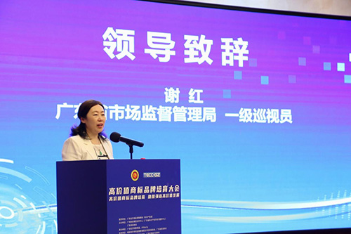 广东省市场监督管理局一级巡视员谢红为大会致辞,强调要深入学习贯彻党的二十大精神,坚持以推动高质量发展为主题,深刻领会把实施扩大内需战略同深化供给侧结构性改革有机结合起来,增强国内大循环内生动力和可靠性,提高国际循环的质量和水平,加快建设现代化经济体系的重要指示精神。她指出,商标作为最重要的知识产权种类之一,是企业内涵、产品质量、制造能力和无形资产的重要的标志,是提升产品贸易国内循环和国际循环质量和水平的重要载体,是支撑现代化产业发展的重要力量。要贯彻落实《知识产权强国建设纲要(2021—2035年)》,加强商标品牌建设,大力培育具有国际影响力的知名商标品牌,提升企业品牌竞争力和国际影响力,这既是促进强大有韧性的国民经济循环体系加快构建新发展格局的现实路径,也是全面提升我省商标品牌事业发展水平的创新实践。同时,要立足当下,着眼广东、放眼世界,推动和培育一批价值度、美誉度高、社会影响力广泛的商标品牌,发展和壮大我们的民族品牌和自主品牌,推动“广东产品”向“广东品牌”转变,进一步促进我省形成企业自主、市场主导、政府推动、行业促进和全社会共同参与的商标品牌战略工作新的格局。