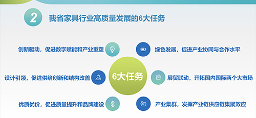会上,王克会长在《产业协作 共同推动广东省家具行业高质量发展》主题演讲中介绍,2022年广东省家具行业整体经济运行稳中向好,2022年销售总额4810亿元,出口值1304.2亿元,内销额3505亿元。2022年广东家具行业规模以上工业企业2022年营业收入2090.4亿元,产量19934.1万件,利润总额125.30亿元。 王会长指出,今年省家具协会召开的第十九届广东省家具行业经济工作会议提出,要推动广东省家具行业高质量发展实现新的跨越,必须提振发展信心,坚持实体经济为本、制造业当家,重点开展6大工作任务:创新驱动,促进数字赋能和产业重塑;设计引领,促进供给创新和结构改善;优质优价,促进质量提升和品牌建设;绿色发展,促进产业协同与合作水平;展贸联动,开拓国内国际两个大市场;产业集群,发挥产业链供应链集聚效应。