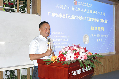 广东新红阳科技有限公司董事总经理朱玉山在致辞中表示,数字化转型是广东家具业实现高质量发展的必然要求。新红阳公司一直致力于家具行业的数字化转型,在致力于打造大湾区数字化智能家具产业园等方面,进行了大量探索和积极实践,也取得了一些成效。期待在本次交流会后,能与省家具协会及与会者保持密切合作,共同推动广东家具企业的数字化转型。