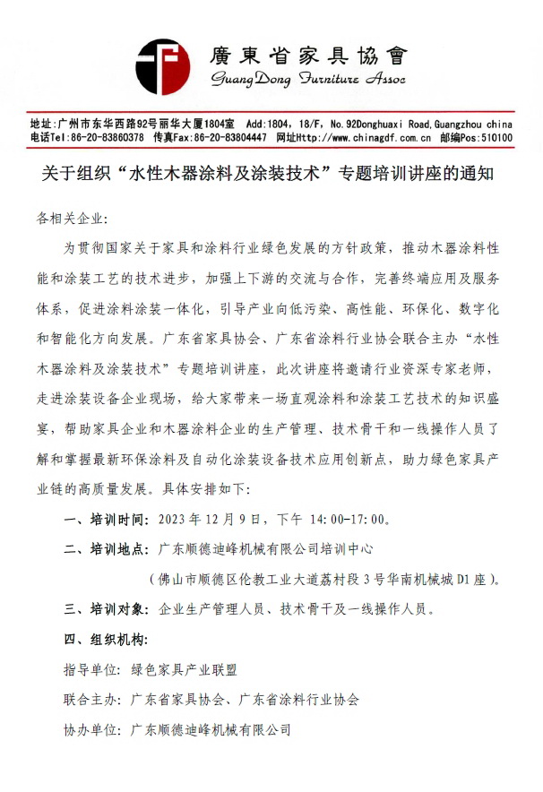 各相关企业: 为贯彻国家关于家具和涂料行业绿色发展的方针政策,推动木器涂料性能和涂装工艺的技术进步,加强上下游的交流与合作,完善终端应用及服务体系,促进涂料涂装一体化,引导产业向低污染、高性能、环保化、数字化和智能化方向发展。广东省家具协会、广东省涂料行业协会联合主办“水性木器涂料及涂装技术”专题培训讲座,此次讲座将邀请行业资深专家老师,走进涂装设备企业现场,给大家带来一场直观涂料和涂装工艺技术的知识盛宴,帮助家具企业和木器涂料企业的生产管理、技术骨干和一线操作人员了解和掌握最新环保涂料及自动化涂装设备技术应用创新点,助力绿色家具产业链的高质量发展。具体安排如下: 一、培训时间:2023年12月9日,下午 14:00-17:00。 二、培训地点:广东顺德迪峰机械有限公司培训中心(佛山市顺德区伦教工业大道荔村段3号华南机械城D1座)。 三、培训对象:企业生产管理人员、技术骨干及一线操作人员。 四、组织机构: 五、培训内容: