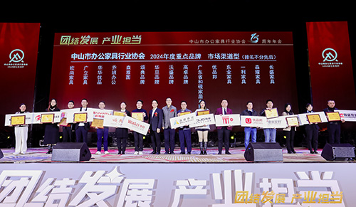 活动上,进行了荣誉授牌。中山市工商联党组成员、副主席谭文辉向中山市办公家具行业协会颁发“中山市四好商会”牌匾。中山办公家具协会向华盛、中泰、迪欧等企业颁发重点品牌牌匾,向根河板业、金诚粘合剂、宏达涂料等企业颁发了2023年度优秀供应商牌匾,向酷家乐、赛德检测、小榄电信等友好单位颁发战略服务商牌匾。