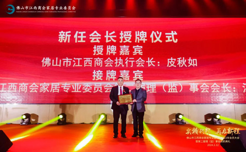 佛山市江西商会执行会长皮秋如为江水生颁授佛山市江西商会家居专业委员会第二届会长牌匾。江水生会长代表家居专委会新一届领导班子发言,对第一届领导班子的付出与奉献,对全体会员的信任与支持表示感谢。江会长表示,在过去的四年里,家居专委会通过举办各种各样的活动为会员和行业赋能。未来四年将继续努力,推进家居专会向更高层次迈进,争取在行业领域中赢得更多发展空间,为会员谋取更多发展机会。
