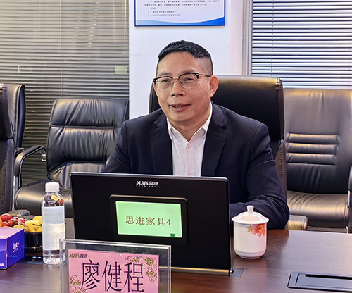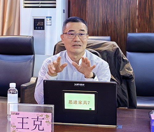 廖健程董事长介绍了思进家具在过去2023年的市场情况、业务表现、产品研发、市场布局等情况。思进家具坚持立足办公、酒店家具板块,同时延伸教育公共家具、医养家具、银行家具等新的商务家具领域,寻求整个商务家具板块的平台布局。廖董事长表示,王克会长的调研指导为思进带来了极大的鼓舞和动力,给予的建议开阔了品牌发展的方向。感谢广东家协对思进的关心和工作指导,我们一定不会辜负协会的期望,继续努力进取,为行业的健康可持续发展贡献力量。