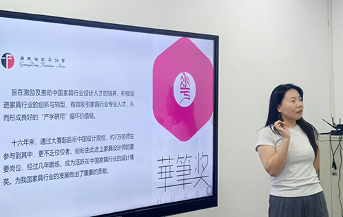 广东家协创新综合部副经理辛宝珊详细介绍了协会及设计专业委员会举办的创新活动,重点讲解了系列大赛的征集细则、参赛对象、投稿方式、评审规则、奖项设置等内容。诚挚邀请学院师生参与“华笔奖”系列家具设计大赛,包括:2025年华笔奖“冠美杯”适老家具设计大赛、“励致杯”办公家具设计大赛,以及即将上线的“星火户外”家具设计合伙人招募、“宜奥杯”软体家具设计大赛等。