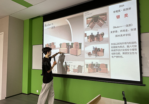 辛宝珊就协会举办的系列设计创新活动进行介绍,包括:设计大赛、广东家协设计专业委员会、设计交流活动等,同时详细讲解了2025年“华笔奖”系列家具设计大赛“冠美杯”“励致杯”“宜奥杯”的征集细则、参赛对象、投稿方式、评审规则、奖项设置等内容,还预告了即将上线的“星火户外”大赛,并对往届“华笔奖”的优秀获奖作品进行详细的分析与鉴赏,对现场师生们的疑问进行解答。宣讲最后她表示,期待同学们参与系列家具设计大赛和设计活动,关注广东家居及家具行业。