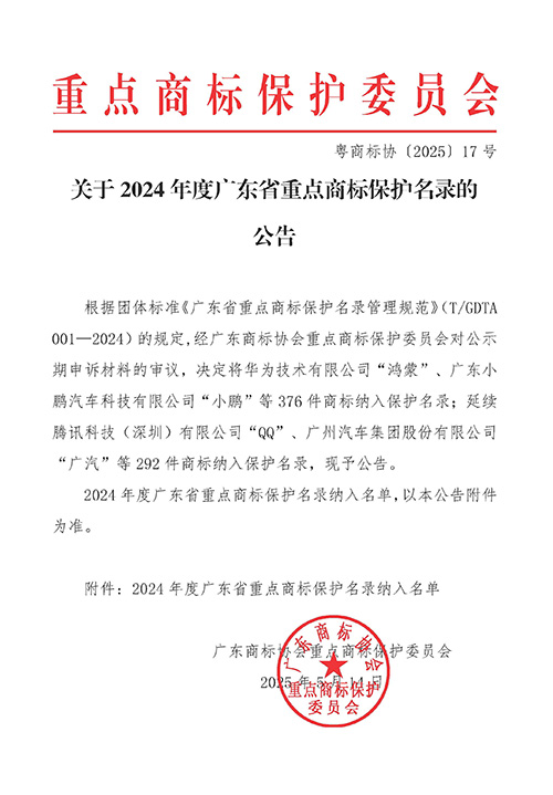 根据团体标准《广东省重点商标保护名录管理规范》(T/GDTA 001—2024)的规定,经广东商标协会重点商标保护委员会审议通过,于5月14日公告了2024年度广东省重点商标保护名录,全省共376件商标纳入保护名录,延续292件商标纳入保护名录。