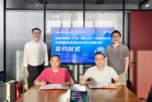 据介绍,印度国际家具博览会WOFX自创办以来规模与影响力持续攀升,2024年展会便吸引了印度26邦及全球21个国家和地区的专业观众,采购商与专业观众总量达13247人,其中90%以上为家具、装饰、照明领域的垂直专业人士——这一数据印证了WOFX作为印度领先家具贸易平台的定位,也使其成为中国家具企业直连印度市场的高效通道。 广东家协副秘书长张靖怡,展览及会员服务部经理王娟容,媒体部经理陈志荣,展览及会员服务部副经理曹添财、刘文龙参加签约仪式。