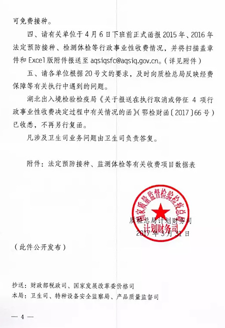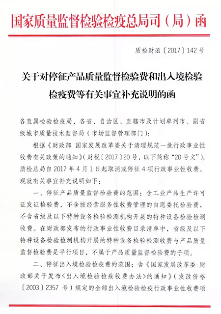 3月28日,质检总局发布贯彻落实取消或停征4项行政事业性收费决定的通知。近日,从质检总局官网获悉,质检总局对停征产品质量监督检验费和出入境检验检疫费等有关事宜作了补充说明,明确了停征项目的范围。 根据《财政部 国家发展改革委关于清理规范一批行政事业性收费有关政策的通知》(财税[2017]20号)(以下简称通知)要求,2017年4月1日起,质检系统将再取消或停征4项中央设立的行政事业性收费,即取消设备监理单位资格评审费;停征出入境检验检疫费、产品质量监督检验费(含工业产品生产许可证发证检验费,不含按经营服务性收费管理的自愿委托检验费)和计量收费(即行政审批和强制检定收费,非强制检定收费不得列入行政事业性收费,不得强制企业接受服务并收费)。 为保证取消或停征收费政策及时有效的贯彻落实,质检总局发布《关于对停征产品质量监督检验费和出入境检验检验费等有关事宜补充说明的函》(质检财函[2017]142号)。对相关范围作出明确要求: 停征产品质量监督检验费的范围:含工业产品生产许可证发证检验费,不含按经营服务性收费管理的自愿委托检验费,不含省级及以下特种设备检验检测机构开展的特种设备检验检测收费。 停征出入境检验检疫费的范围:含《国家发展改革委 财政部关于发布<出入境检验检疫收费办法>的通知》规定的全部出入境检验检疫行政事业性收费项目。 文件如下: