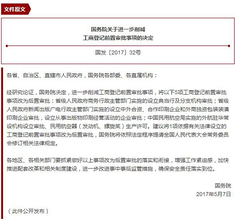 国务院印发《关于进一步削减工商登记前置审批事项的决定》 2017-5-12 来源:中国政府网